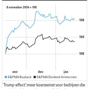 Maar strategen vermoeden – of hopen – dat Trump tot een generaal pardon voor deze cash over zal gaan, waardoor bedrijven geen 35 maar bijvoorbeeld 10% over deze cash hoeven te betalen. Dit in de hoop dat Amerikaanse bedrijven (een deel van) dit geld zullen investeren waardoor werkgelegenheid en economische groei in de VS zullen aantrekken. En dus zijn de strategen van banken aan het rekenen geslagen. Volgens Goldman Sachs Private Wealth Management is zo’n $1 bln ($1000 mrd) aan cash beschikbaar. Een deel daarvan zou voor de inkoop van eigen aandelen gebruikt kunnen worden. Daardoor wordt de totale winst over een kleiner aantal aandelen verdeeld. Dit zou een positief effect van $1-2 per aandeel – ofwel zo’n anderhalf procentpunt – op de gemiddelde winst per aandeel van de bedrijven uit de S&P500 kunnen hebben, aldus de vermogensbeheerder.