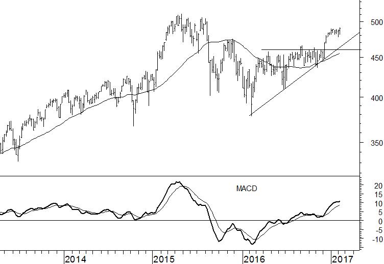 Het is niet meer dan logisch dat de AEX binnenkort een vervolg gaat geven aan deze stijgende trend. Een doorbraak boven 490 is daarvoor het bewijs en vormt de opmaat voor een verdere opmars naar het hoogtepunt van 2015 op 510. Alle elementen binnen het technische beeld ondersteunen dit, zoals de MACD-indicator en het 40-weeks gemiddelde. Aan de onderkant trekken wij het eerste steunniveau op naar 460, het niveau van de onderliggende steunlijn. Een eventuele correctie naar dit niveau is een goed instapmoment voor beleggers die nu nog aan de zijlijn staan.
