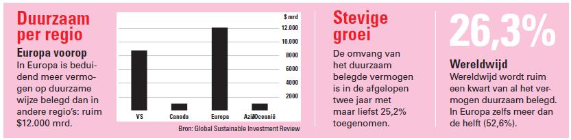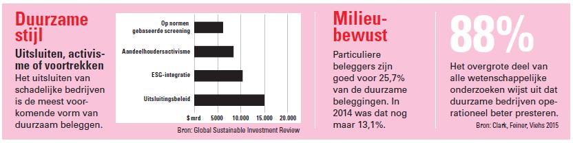 De positieve effecten strekken overigens aanzienlijk verder dan de financiële voordelen. Het risico van een onderneming die op zorgvuldige wijze omspringt met maatschappij en milieu ligt aanzienlijk lager dan bij een bedrijf dat te veel nadruk legt op winstmaximalisatie. De voorbeelden van dit gevaar liggen bij vele beleggers nog vers in het geheugen, zoals de ramp bij het boorplatform van BP in de Golf van Mexico en het schandaal met de sjoemelsoftware bij Volkswagen.