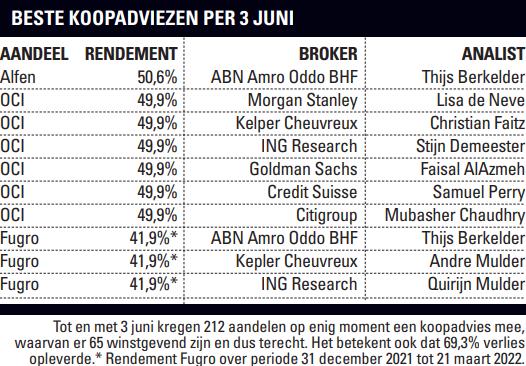 De mooie rendementen die beleggers dit jaar tot nu toe met Alfen, OCI en Fugro hebben kunnen behalen, kunnen niet verhullen dat het een bijzonder slechte periode is geweest voor aandelen. Dat blijkt ook uit het relatief geringe aantal positieve analistenaanbevelingen die in deze ruim vijf maanden daadwerkelijk een positief rendement hebben opgeleverd. Tot en met 3 juni kregen bij de tien onderzochte banken en brokers in totaal 212 aandelen op enig moment een koopadvies mee. Daarvan waren er maar 65 winstgevend (30,7%). De overige 147 adviezen (69,3%) leverden verlies op.