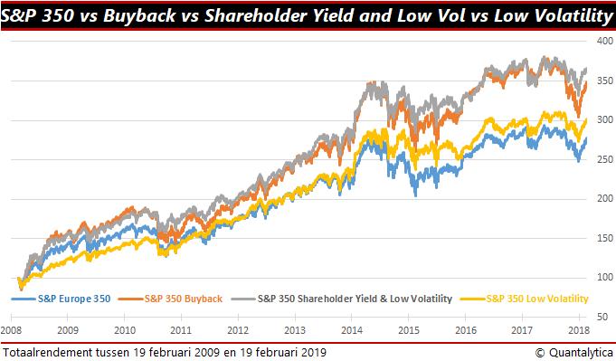 Als je naar het rendement over de voorbije tien jaar kijkt, zie je dat de Europese buyback-index van Standard & Poor’s het duidelijk beter heeft gedaan dan het marktgemiddelde. De combinatie van shareholder yield en low volatility doet het nog beter. Hierbij zij opgemerkt dat wellicht de koersontwikkeling van laagvolatiele aandelen de motor achter het rendement van shareholder yield was. Van de shareholders yield-index bestaat evenwel geen stand alone variant. Maar aan het rendement van de loepzuivere low volatility-index kun je wel aflezen dat het daarvan de resultante is. De waardeontwikkeling van laagvolatiele aandelen is immers aanzienlijk hoger dan dat van de S&P Europe 350.