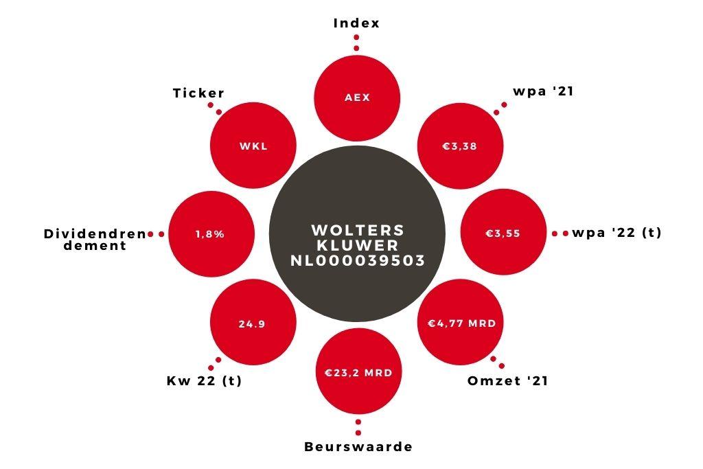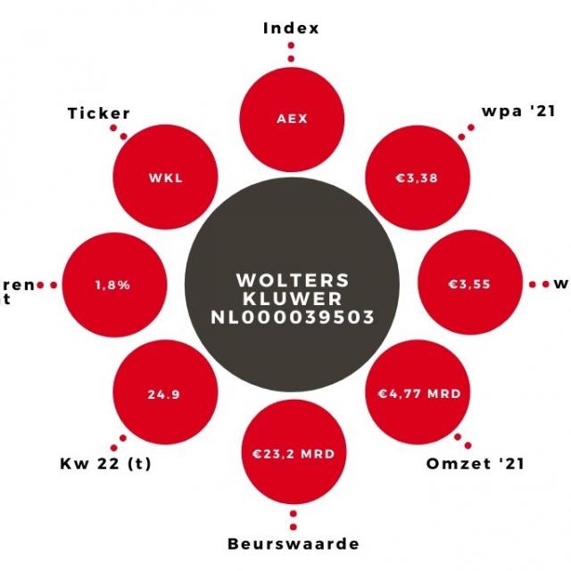 Boven op het al uitgekeerde tussentijdse dividend komt een slotdividend van €1,03 per aandeel. Dit brengt de totale uitkering op €1,57, een stijging van 15%. Vorig jaar werd voor €410 mln aan aandelen ingekocht, en dit bedrag wordt in 2022 opgetrokken naar €600 mln. Tot 21 februari was daarvan al €50 mln besteed. Wolters Kluwer mikt voor 2022 op een omzetgroei die iets lager zal uitkomen dan vorig jaar. De winstmarge zou met 25,5 tot 26% echter wel een fractie hoger liggen en de winst per aandeel zal met ongeveer 5% toenemen.