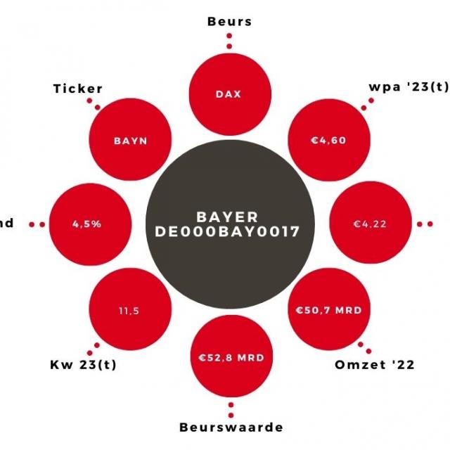 Na de cijferpublicatie daalde de koers met 10%. Die terugval volgt op een rally van ruim 15% sinds eind 2022, die werd veroorzaakt door gunstig nieuws over nieuwe medicijnen in de pijplijn en de komst van een nieuwe topman. Deze zaken wegen zwaarder dan de factoren die 2023 tot een lastig jaar maken. Omdat de juridische risico’s naar de achtergrond verdwijnen na de glyfosaat-schikking, die gevolgd werd door enkele zeges in de rechtbank, en omdat de waardering (k/w 11,5) en het dividendrendement (4,5%) onverminderd aantrekkelijk zijn, blijft het koopadvies voor het aandeel Bayer van kracht.