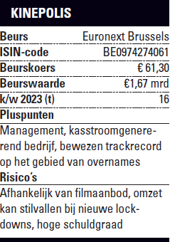 De coronamaatregelen worden in verschillende landen versoepeld en daar zou bioscoopuitbater Kinepolis van moeten kunnen profiteren. De bioscoopketen is wereldwijd actief en heeft een portefeuille die bestaat uit 108 bioscopen. Daarvan staan er 58 in Europa. De overige 50 bevinden zich in Noord-Amerika. In 2016 stond de teller nog op 48 bioscopen, de ruime verdubbeling toont de expansiedrift.