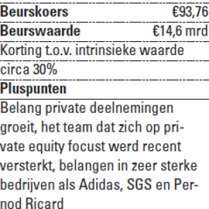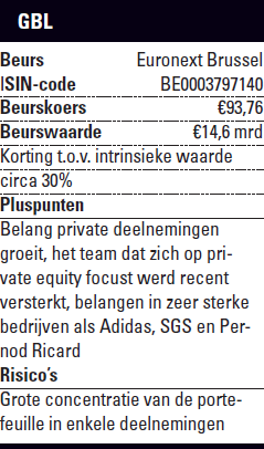 Toch zit een groot deel van de portefeuille nog altijd geconcentreerd in een aantal beursgenoteerde bedrijven. Enkele bekende namen zijn Adidas, SGS en Pernod Ricard, bedrijven die het over het algemeen wel goed hebben gedaan de laatste jaren. Ondanks dat een belegging in GBL de laatste tien jaar een gemiddeld rendement opleverde van 10% per jaar blijft het rendement ten opzichte van andere holdings flink achter, met name wanneer we dat afzetten tegen de Belgische holdings Sofina en Brederode. Oorzaak is de kleinere blootstelling aan private equity waardoor de waardering bij GBL achterblijft.