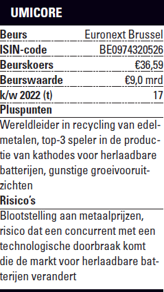 Het Belgische Umicore bestaat uit drie divisies die allemaal inspelen op het thema duurzaamheid. Met de recyclingdivisie is het wereldleider in de recycling van edelmetalen. Daarbij kunt u denken aan de recycling van industrieel afval, elektronisch schroot, batterijen, katalysatoren van auto’s en brandstofcellen. Dit is een zeer winstgevende activiteit die tegelijkertijd ook weinig kapitaalintensief is. 2021 was een recordjaar voor deze tak, omdat de prijzen van verschillende metalen enorm opliepen. Komend jaar zal de winstgevendheid van de recyclingdivisie naar verwachting wat afnemen, maar vanuit historisch perspectief volgens het management wel sterk blijven.
