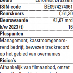 Bij een geschatte k/w 2023 van 16 is het aandeel Kinepolis ondanks dat het niet actief is in een groeimarkt koopwaardig. Daarin voel ik me gesteund door de koersdoelen van analisten, die tussen de €64 en €79 per aandeel liggen.