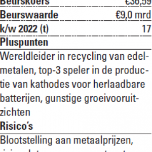 Daarnaast bezorgde een winstwaarschuwing door het bedrijf zelf beleggers een koude douche. Door investeringen in de uitbreiding van de productiecapaciteit en een versnelde verschuiving van kathodes met een laag nikkelgehalte naar kathodes met een hoog nikkelgehalte en minder kobalt, verwacht het bedrijf op de korte termijn (2022 en 2023) een beperkte winstgroei voor deze activiteit.