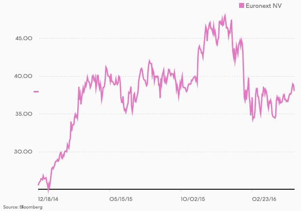 Beursbedrijf Euronext maakte donderdag 12 mei bekend dat de omzet in het eerste kwartaal met 3% is gedaald naar €126,5 mln. Dankzij aanhoudende kostenbesparingen verbeterde de ebitda-marge van 52,2% naar 56,8% en hierdoor bleef de daling van de operationele winst beperkt tot 1% (naar €69,0 mln). De nettowinst bleef stabiel op €48,0 mln. Door de inkoop van eigen aandelen steeg de winst per aandeel zelfs van €0,68 naar €0,69. Dat is een keurige prestatie, aangezien het beursklimaat in de eerste drie maanden van 2016 veel zwakker was dan een jaar geleden. Hierdoor daalde de omzet uit beursgangen met 7%. Dat effect werd voor een deel gecompenseerd door hogere inkomsten bij de divisie Market data and indices, die via het in licentie geven van data van onder meer de AEX profiteert van de groeiende handel in ETF’s.
