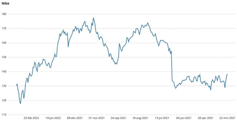 De blijvend sterke vraag naar schoenen en (sport)kleding stemt analisten echter positief, met vannacht direct al hogere koersdoelen door de analisten van J.P.Morgan (van $162 naar $164), Credit Suisse ($160 naar $165) en Cowen & Company (van $144 naar $154). Dat is allemaal ver boven de slotkoers van maandag, toen Nike de handelsdag afsloot op $130.