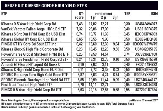 Ook andere aanbieders als iShares, ProShares en WisdomTree hebben vergelijkbare oplossingen met andere indices, helaas wel alleen voor de dollarmarkt. FirstTrust heeft zelfs een zogeheten 130/30-oplossing waarbij een 30%-shortpositie wordt gebruikt om 130% long te beleggen in high yield-leningen die volgens een bepaalde rekenregel meer moeten opleveren, een zogeheten ‘smart-bèta’ ETF. We willen overigens een te groot enthousiasme over lage of zero-duration ETF’s temperen. Ze suggereren een laag risico, wat niet zo is. Verder zijn high yield-obligaties sowieso minder rentegevoelig dan andere obligaties, omdat ze meer met het aandelensentiment meebewegen. Bovendien bestaan dergelijke ETF’s nog niet zo lang en we weten niet hoe ze werken in crisistijd. Tot slot zijn ze erg duur.