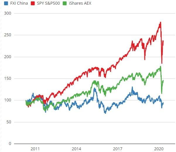 Voor onze optietip vergelijken we het koersverloop van de FXI China ETF (dollar), de S&P500 SPY ETF en de IShares AEX ETF over een periode van tien jaar. Het valt dan op dat de FXI China ETF met een redendement van +13,2% ver achterblijft bij dat van de S&P500 SPY ETF (+177%) en de iShares AEX ETF (+83,3%). Waar Amerikaanse en Nederlandse aandelen zich voornamelijk in een opwaarts trendkanaal bevonden, ging de FXI China ETF voornamelijk zijwaarts.