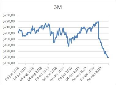 Het aandeel van het veelzijdige industriële conglomeraat 3M, dat zichzelf omschrijft als technologiebedrijf, is in 2019 de grootste daler binnen de Dividendportefeuille. Maandag 3 juni sloot het aandeel op een nieuwe laagste jaarstand van $160,04, oftewel een min van 16% in 2019.