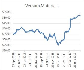 Ik tipte het aandeel op 5 december op $33,49 na een flinke koersdaling. Het speciaalchemiebedrijf, actief als toeleverancier aan de halfgeleider- en beeldschermindustrie, ging in september 2016 naar de beurs en startte in 2017 met het uitkeren van dividend. Dat laatste was de reden voor de kooptip: ik verwachtte forse dividendverhogingen gezien de lage payout en ijzersterke kasstroom van Versum, dat met een sterke balans ook ruimte had voor acquisities. Het liep echter anders, want Versum werd zelf prooi.
