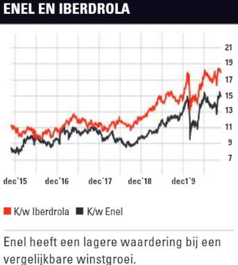 Maar voorlopig hebben de nutsbedrijven volgens BofAML nog een voorsprong op de oliemajors bij het verkrijgen van terreinen voor bijvoorbeeld windparken en het aansluiten van nieuwe productiefaciliteiten op het transmissienetwerk. Wie Iberdrola in portefeuille heeft, mag het dan ook zeker houden, maar mijn voorkeur blijft uitgaan naar Enel. Het aandeel heeft een lagere waardering dan Iberdrola – al is dat niet ongebruikelijk (zie grafiek) – en een hoger dividendrendement, terwijl de winstgroei naar mijn verwachting de komende drie jaar op een zelfde niveau ligt. Ook zijn de schuldratio’s van Enel gunstiger. De verhouding tussen netto schuldpositie en ebitda is (en blijft) 2,7 bij Enel terwijl deze ratio bij Iberdrola de komende jaren op het huidige niveau van 3,7 blijft hangen.