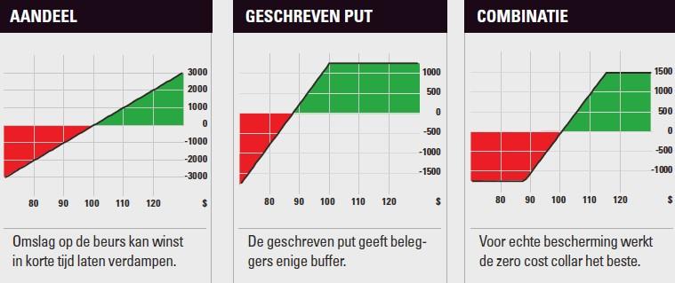 Voor de totale combinatie ontvangt de belegger $0,30, hetgeen in de praktijk neerkomt op $30. Met deze constructie blijft een belegger meedoen met toekomstige koersstijgingen en weet hij op voorhand hoe hoog het maximale verlies kan worden ten opzichte van de huidige beurskoers. Daarmee verzekert de belegger zichzelf tegen een ommekeer in het beursklimaat en blijft een groot deel van de eerder in het jaar opgebouwde winst in technologie-aandelen zeker behouden.