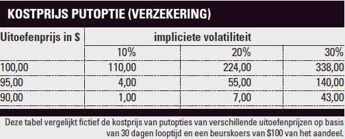 Het verschil in de kostprijs van putopties wordt hieronder verduidelijkt in de tabel ‘kostprijs putopties’. Daarin zien we dat out-of-the-money putopties met een looptijd van dertig dagen en een uitoefenprijs van $95 en $90 een stuk goedkoper zijn dan at-the-money putopties van $100. Daarnaast zien we dat de kostprijs van bescherming flink oploopt per uitoefenprijs zodra de impliciete volatiliteit (verwachte beweging) toeneemt. Betaalt een belegger bij een impliciete volatiliteit van 10% slechts $4 voor een putoptie van $95 met een looptijd van 30 dagen, bij een impliciete volatiliteit van 30% hebben we het al snel over een bedrag van $140.