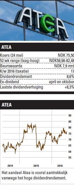Over het eerste kwartaal van 2016 rapporteerde het bedrijf een 11,5% hogere omzet van NOK7,2 mrd, wat beter was dan verwacht. Ondanks de mooie omzetgroei bleef het eerste kwartaal licht achter bij de gemiddelde analistenconsensus met een ebitda van NOK209 mln (consensus NOK212 mln). De zeven analisten die het aandeel Atea volgen (vier keer kopen, twee keer houden en een keer verkopen) rekenen voor heel 2016 gemiddeld op een omzet van NOK30,2 mrd (+8,2%), met een winst per aandeel die daarbij oploopt van NOK3,72 in 2015 naar NOK4,44 dit jaar.