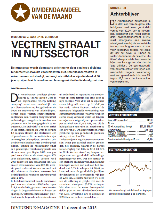 In het dividend E-magazine van december 2015 kunt u meer lezen over Vectren (aandeel van de maand op pagina 9, zie ook de PDF hierboven).