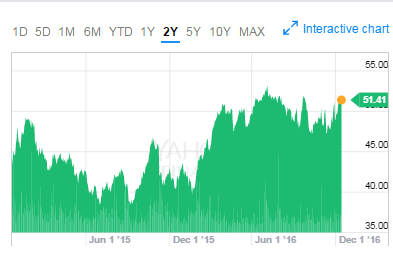 Na een koersdaling van 10% tipte ik het aandeel eind 2015 op een koers van $40,81. Dat bleek achteraf gezien een prima timing met een forse koersstijging begin 2016, vooral door de vlucht van beleggers naar alles met een bovengemiddeld dividendrendement, die de nutssector één van de grote uitblinkers maakten.
