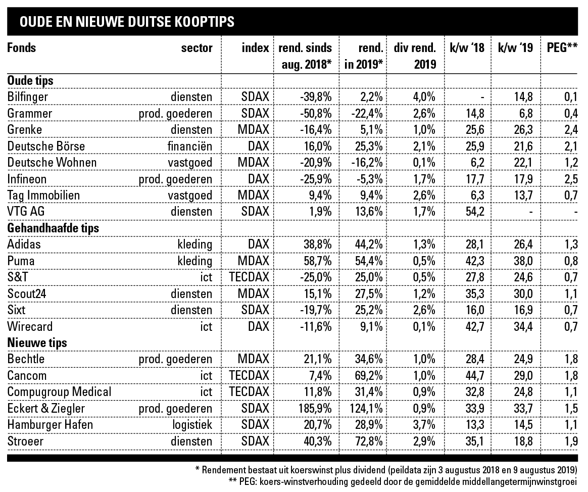 Het is dan ook niet verwonderlijk dat veel van de tips hetzelfde matige beeld vertoonden. Adidas was echt de uitblinker met een plus van 44%, samen met branchegenoot Puma, die zelfs een koersstijging van 54% realiseerde (zie tabel). De andere tips presteerden slecht, zoals Grammer, Bilfinger, Grenke en Infineon, die zelfs in 2019 in koers daalden of slechts licht stegen. Deutsche Wohnen was er ook een voorbeeld van, maar dat aandeel is voorafgaande aan de grote daling op ‘verkopen’ gezet. Dat was naar aanleiding van een huurdersopstand doordat de huren van woningen in Berlijn, de stad waar het bedrijf vooral actief is, snel zijn gestegen. Sectorgenoot Tag Immobilien heeft de vastgoedbezittingen voor een belangrijk deel elders en presteerde met twee keer +9,4% beter. De overige bedrijven lieten in 2019 wel goed herstel zien, zoals VTG (+14%), Wirecard (+10%) en S&T (+21%). Dat was goed te noemen. Tevreden was ik ook over Deutsche Börse en Scout24, die in 2018 en 2019 stegen en in totaal op ruim  25% koersstijging uitkwamen.