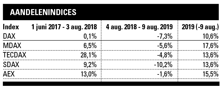 Onder invloed van de economische groeivertraging heeft de Duitse beurs slecht gepresteerd sinds mijn laatste artikel over Duitsland, in september 2018. Van 1 juni 2017 tot 3 augustus 2018 (slotkoersdag) steeg de DAX-index welgeteld met 0,1%. Van 4 augustus 2018 tot en met 9 augustus 2019 (de nieuwe slotkoersdag) staat er een daling met 7,3%; 2019 laat hier wel een stijging zien van 10,6%. De AEX-index deed het beter (zie tabel). De najaarsdip in 2018 heeft er met flinke koersdalingen stevig in gehakt en het positieve beursjaar 2019 heeft dat niet helemaal gecompenseerd.