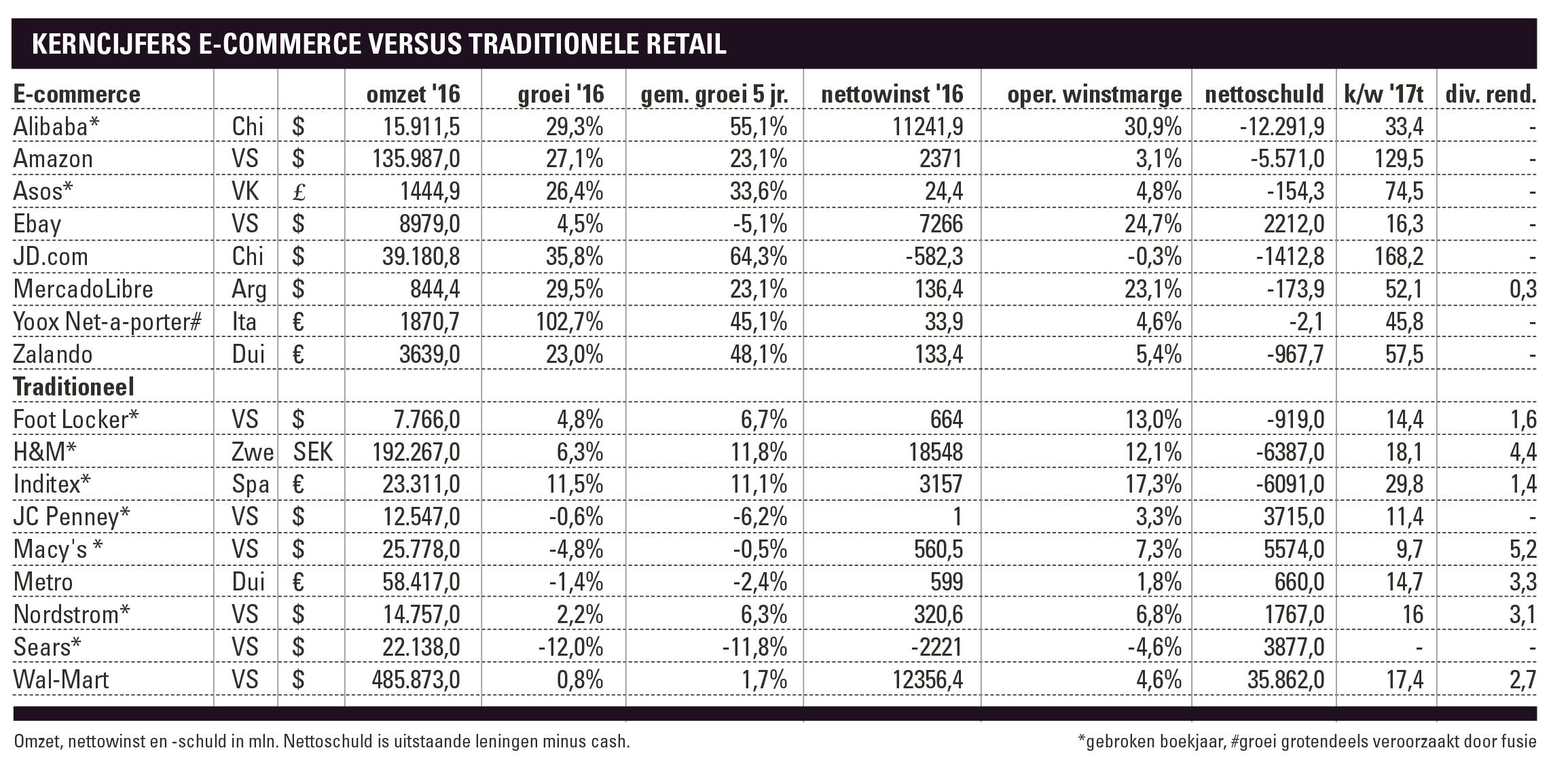 Om te beginnen is het nogal voorbarig om de e-commercesector al tot overwinnaar uit te roepen. De meeste data die we kunnen vinden, geven aan dat e-commerce wereldwijd goed is voor minder dan 10% van de totale detailhandelsverkopen. Ook in landen waar e-commerce al heel normaal is, is het aandeel lang niet zo hoog als je zou kunnen denken aan de hand van krantenkoppen. In de VS, waar je product via Amazon nog op de dag van bestelling wordt afgeleverd, was e-commerce in 2016 goed voor 8,1% van de totale detailhandelsomzet in 2016. Voor Nederland zijn betrouwbare cijfers lastig te vinden, maar het ligt in de buurt van het Amerikaanse percentage. Consumenten geven hun geld dus nog steeds vooral uit in echte winkels. De bewering dat internetshops de ‘stenen’ winkels al aan het verslaan zijn, is dus overdreven. Wel is de groei van e-commerce overduidelijk veel groter dan die van de ‘gewone’ winkels. Bedrijven als Amazon en Alibaba groeien veel harder dan de traditionele detailhandelsbedrijven (zie tabel). E-commerce is dus nog allerminst groter dan de gewone winkels, maar wint wel terrein.