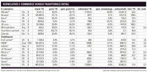 Er is dus niet zo zeer sprake van een strijd tussen twee typen bedrijven, als wel van een concurrentiestrijd tussen alle detailhandelaars onderling. Veel e-commercebedrijven hebben daarbij goede kaarten in handen vanwege de groei die ze boeken. Maar als die groei is bereikt door extreem lage prijzen, is het de vraag hoe duurzaam dat is. Concurreren op prijs is niet vol te houden als de winstmarges te klein zijn. De operationele marges van de Europese online kledingbedrijven Zalando, Yoox en Asos zijn bijvoorbeeld veel lager dan de marges van Inditex en H&M (zie tabel). De eerste groep mag dan wel veel harder groeien, maar het is de vraag wat er van die groei overblijft als ze hogere prijzen gaan vragen om de winstmarges te verbeteren. Het kan natuurlijk tactiek zijn om marktaandeel te winnen, en de prijzen te verhogen zodra een groot marktaandeel bereikt is. Maar op internet is prijsvergelijking zo eenvoudig dat het niet aannemelijk is dat webwinkels op een gegeven moment de prijzen kunnen verhogen zonder marktaandeel te verliezen. De traditionele winkelketens hebben ook obstakels; veel aankopen in de winkel zijn vooraf gegaan door zoekacties door klanten op internet. Of retailers dus willen of niet, hoe ze op het internet aanwezig zijn is erg belangrijk.
