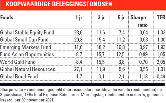 Verder hebben we bij aandelen voor twee fondsen per subcategorie gekozen. Bij actieve fondsen is het van belang ook weer te spreiden. Daarnaast hebben we een ‘sector-bet’ gemaakt voor grondstoffenaandelen, vanwege het actuele inflatiethema en de relatief lage waarderingen van deze aandelen in deze sector, bijvoorbeeld in vergelijking met veel groeifondsen. Vanwege het specifieke thema zou de allocatie naar deze twee fondsen maximaal 5 tot 10% van de aandelenportefeuille mogen bedragen. In vergelijkbare selecties van de beste fondsen kozen we vorig jaar nog voor milieu als thema. Dat had ook ditmaal weer gekund, maar in deze hoek zijn veel aandelen al flink duurder geworden door de sterke groei van duurzaam beleggen.