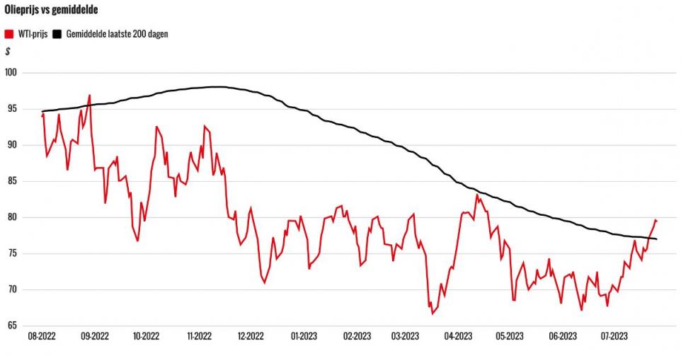 Voor het eerst in bijna een jaar noteert de Amerikaanse olieprijs (WTI) boven de gemiddelde koers van de afgelopen 200 dagen.