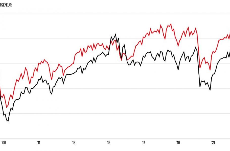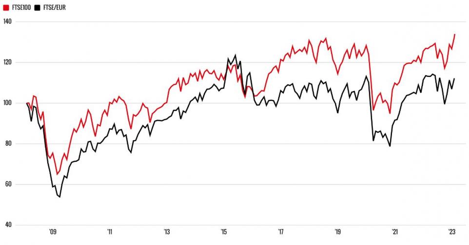 Voorts verkleurt de zwakke Britse pond het beeld. Wereldwijd opererende bedrijven, zoals HSBC en Shell, hebben daarmee een belangrijk concurrentievoordeel. Ter illustratie van de zwakte van de Britse pond hebben we de grafiek van de FTSE100 van de afgelopen vijftien jaar in lokale valuta afgezet tegenover dezelfde index omgerekend naar euro’s. Bij die laatste is de recordstand van april 2015, dus vóór het Brexit-referendum, nog ver weg.