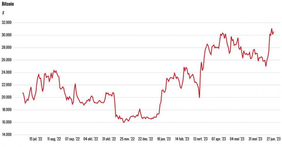 De bitcoin steeg op weekbasis met 13,6% en eindigde daarmee op een koers van $30.101. Ethereum, de tweede grootste cryptovaluta naar marktkapitalisatie, kleurde eveneens groen en won 7,9%.