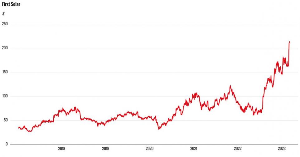 First Solar bereikte afgelopen week de hoogste koers sinds 2008 na een positief rapport van UBS. De analisten van de Zwitserse vermogensbeheerder menen dat de internationale producent van zonnepanelen als geen ander zal profiteren van de Inflation Reduction Act. Dat is de Amerikaanse wetgeving die onder meer voorziet in miljarden dollars aan belastingvoordelen voor bedrijven die met hun producten schone energie bevorderen. UBS gaat ervan uit dat First Solar de productie van zonnepanelen in de VS in 2027 meer dan zal hebben verdubbeld.