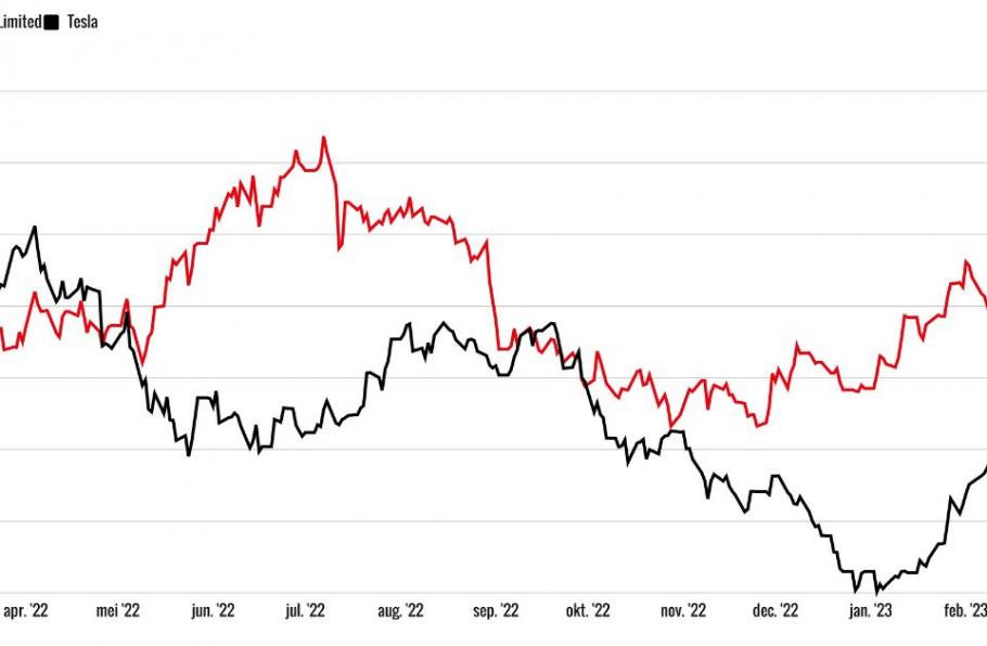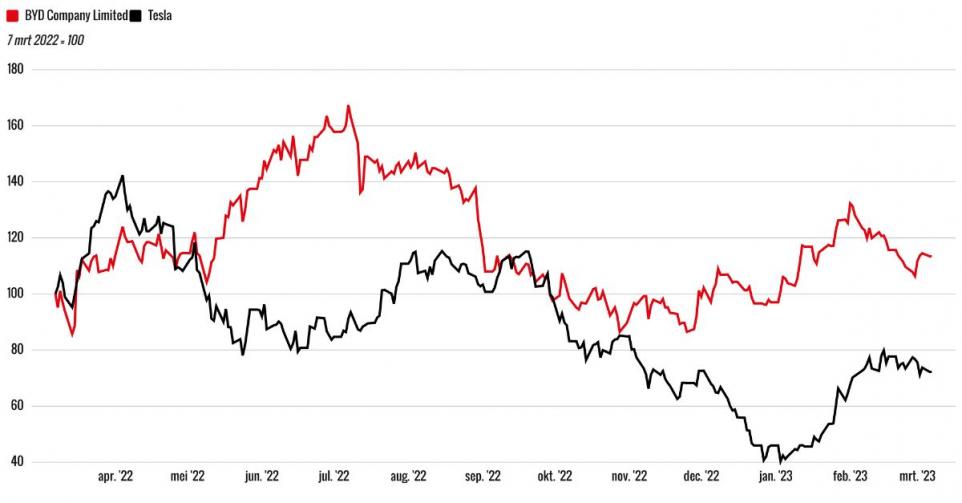 Op de beurs van New York heeft het aandeel BYD Company Limited sinds begin februari ruim 10% ingeleverd, waarbij zo’n $18 mrd in beurswaarde in rook is opgegaan. Dit terwijl het aandeel Tesla na een enorme opmars in de eerste anderhalve maand van 2023 de laatste weken goed is blijven liggen.