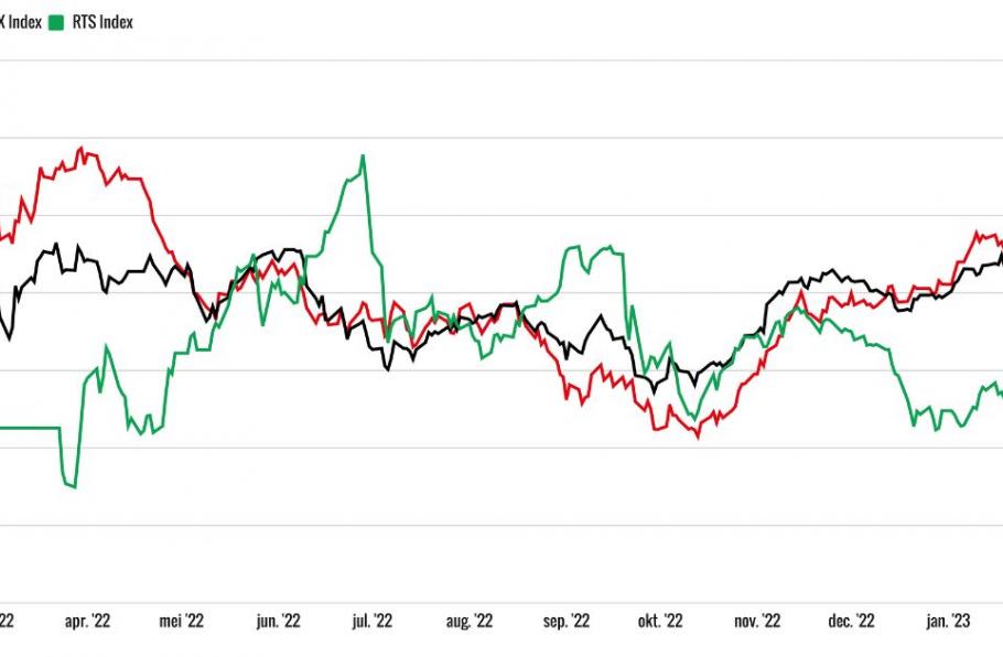 Opvallend is dat de RTSI in Moskou na de eerste zeer forse koersklappen direct na de invasie en na een wekenlange sluiting snel herstelde in de lente, overigens wel gemeten in de zwaar gekelderde Russische roebel. Na een piek eind juni volgde echter weer een neergang en de RTSI noteerde maandag een kleine 20% onder de slotkoers van 23 februari, de dag voor de invasie.
