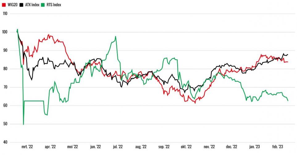Ook de ATX in Wenen kreeg het na de invasie zwaar te verduren met een koersverlies tot ruim -27% op het dieptepunt 29 september. Vandaar volgde echter krachtig herstel, waardoor de ATX het verlies sinds de invasie in 2022 zelfs nog geheel goedmaakte. Bij de WIG in Warschau werd het maximale verlies bereikt op 13 oktober met -33,4% sinds de invasie, maar ook hier bracht een eindsprint enige verlichting (-12,1% tussen 23 februari en einde van het jaar).