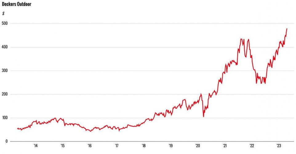 In tegenstelling tot nagenoeg alle sectorgenoten die gebukt gaan onder dalende consumentenbestedingen, weet Deckers Outdoor record na record te breken. De beurskoers tikte op het moment van schrijven een all-time high van meer dan $485 aan.