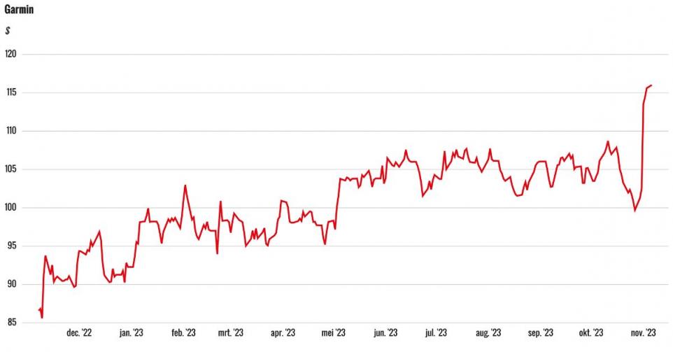 Beleggers beloonden de beter dan verwachte kwartaalcijfers en een outlookverhoging met een koerssprong van 10%. Garmin, genoteerd in New York, maar gevestigd in Zwitserland, ziet een groeiende vraag naar de innovatieve fitness- en sportproducten, die samen met de outdoor navigatiesystemen inmiddels goed zijn voor meer dan de helft van de totale omzet. Lang geleden streden TomTom en Garmin nog als grote concurrenten met elkaar op de automarkt, maar Garmin wist andere groeimarkten aan te boren; de omzet van de autosector stond in 2022 nog maar in voor 11% van het totaal.