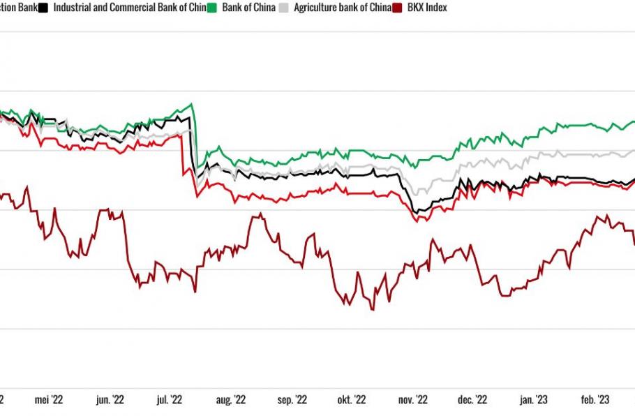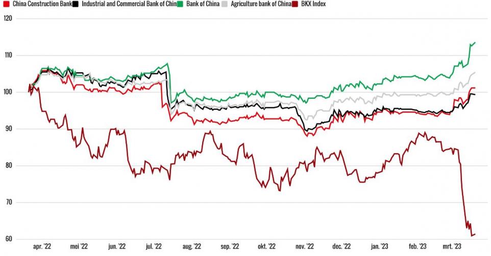 Terwijl afgelopen week de Amerikaanse bankenindex met tientallen procenten onderuit ging door de problemen omtrent Silicon Valley Bank en Credit Suisse, stegen de aandelen van China Construction Bank, Industrial and Commercial Bank of China, Bank of China en Agricultural Bank of China doordat de Chinese centrale bank steeds meer actie onderneemt.
