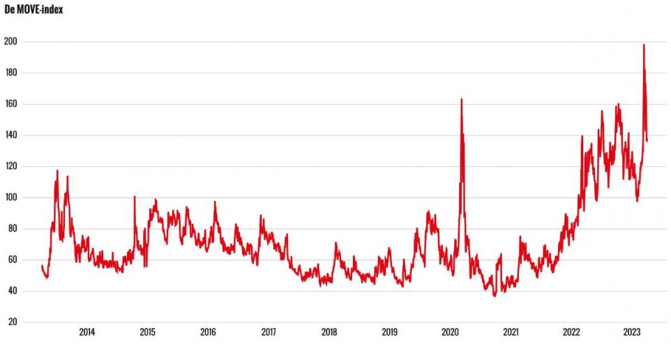 De recente bankencrisis zorgde pas echt dat de Fed controle over de obligatiemarkten verloor, maar meerdere nieuwe steunmaatregelen leidden er uiteindelijk toe dat de MOVE-index deze week weer onder de 150 zakte. De Fed heeft de controle hervonden, maar de grote vraag is voor hoe lang…