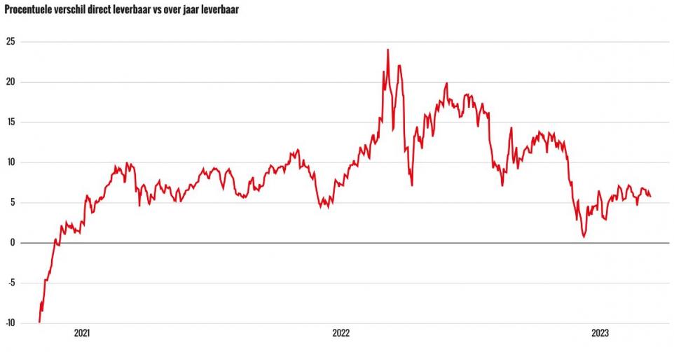 De activiteit op de spotmarkt geeft daardoor goed weer of de oliemarkt in een overschot of een tekort zit. Drijven raffinaderijen de spotprijs op, tot boven de prijzen van toekomstige levering van olie, dan neemt de wereldwijde economische activiteit toe. In de grafiek zien we het procentuele verschil in prijs tussen olie (Brent) die meteen leverbaar (spot) is en olie die pas over een jaar leverbaar is. Dit verschil is momenteel 6%.