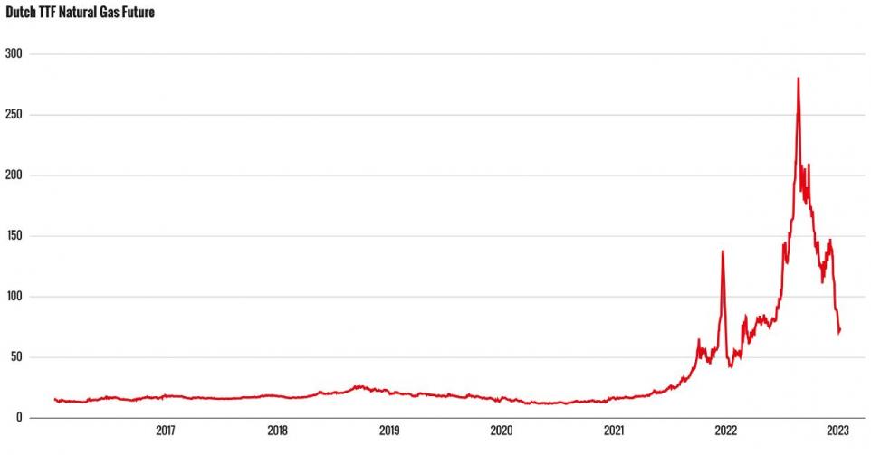 Op 25 augustus 2022 bereikte de Dutch TTF Natural Gas Future een hoogste stand ooit van 281 ect/m3. Inmiddels is duidelijk dat de temperaturen aan het begin van januari een ongekende weergebeurtenis waren. In acht Europese landen werden temperatuurrecords voor januari gebroken en niet met een graad, maar met vier à vijf graden.