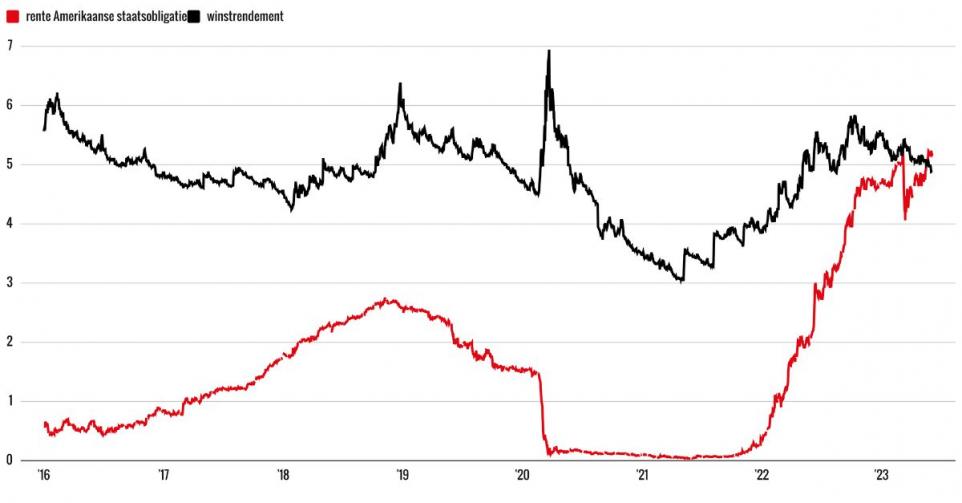 In de grafiek vergelijken we de ‘earnings yield’ (de wpa gedeeld door de koers) van de S&P500 en het rendement op Amerikaanse staatsobligaties met een looptijd van 12 maanden.