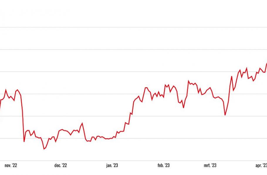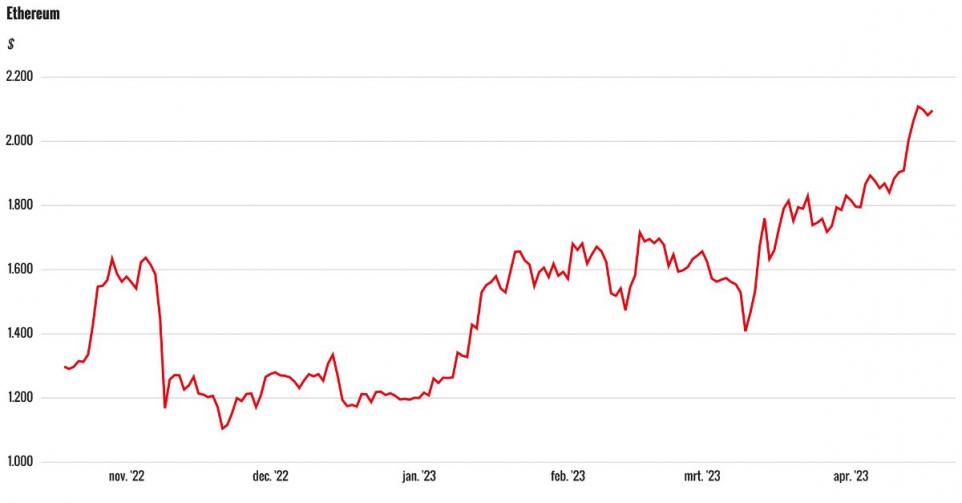 De tweede belangrijkste cryptovaluta naar marktkapitalisatie ($247 mrd) brak donderdag door de $2000, een niveau dat we sinds augustus 2022 niet meer hadden gezien. Dat ethereum er zo goed bij ligt de laatste weken is deels te verklaren door het positieve sentiment. De Crypto Fear & Greed Index, die het sentiment meet, wijst met een stand van 63 punten op een fase van hebzucht.