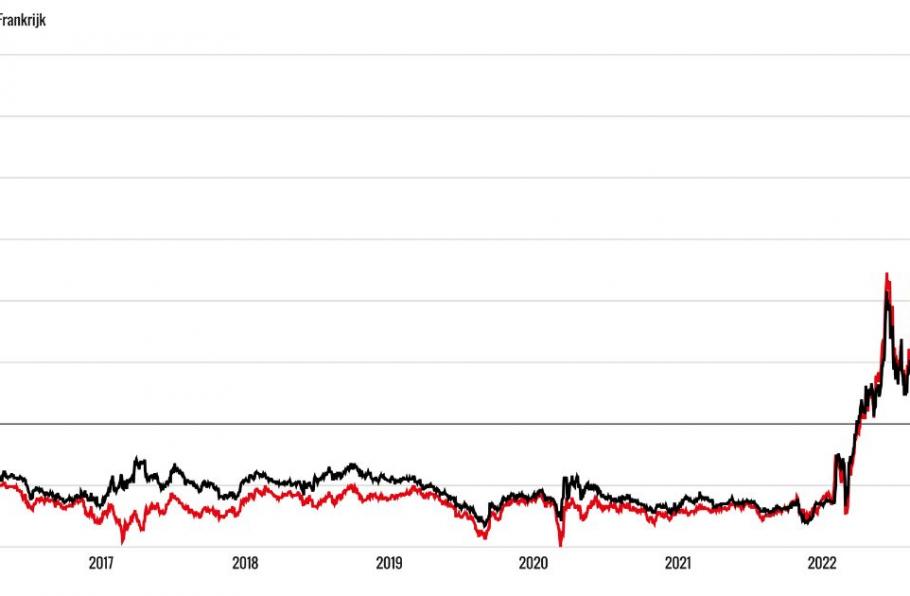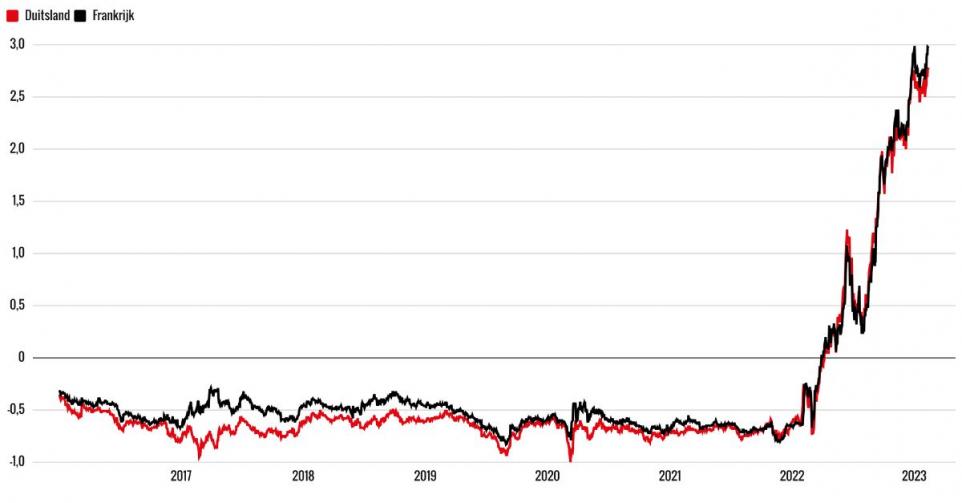 Een jaar geleden noteerden de Duitse en de Franse tweejaarsrente 50 basispunten onder de nul. Inmiddels is dat 350 basispunten hoger.