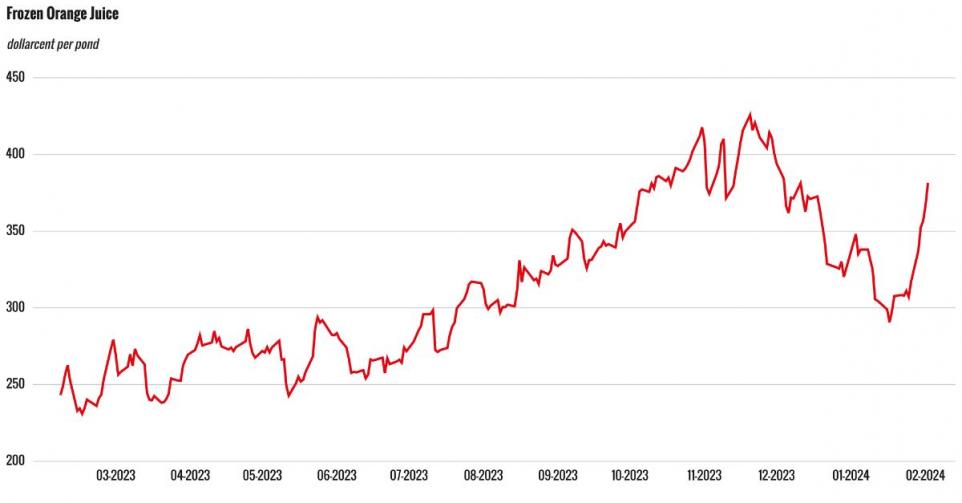 De oorzaak van de heftige stijging van afgelopen was het nieuws dat de voorraad sinaasappelsap bij Amerikaanse voorraadhuizen een nieuw dieptepunt heeft bereikt. Er zijn in de VS nu 180 miljoen pond sinaasappelen. Het gemiddelde over de afgelopen vijf jaar was 570 miljoen pond.