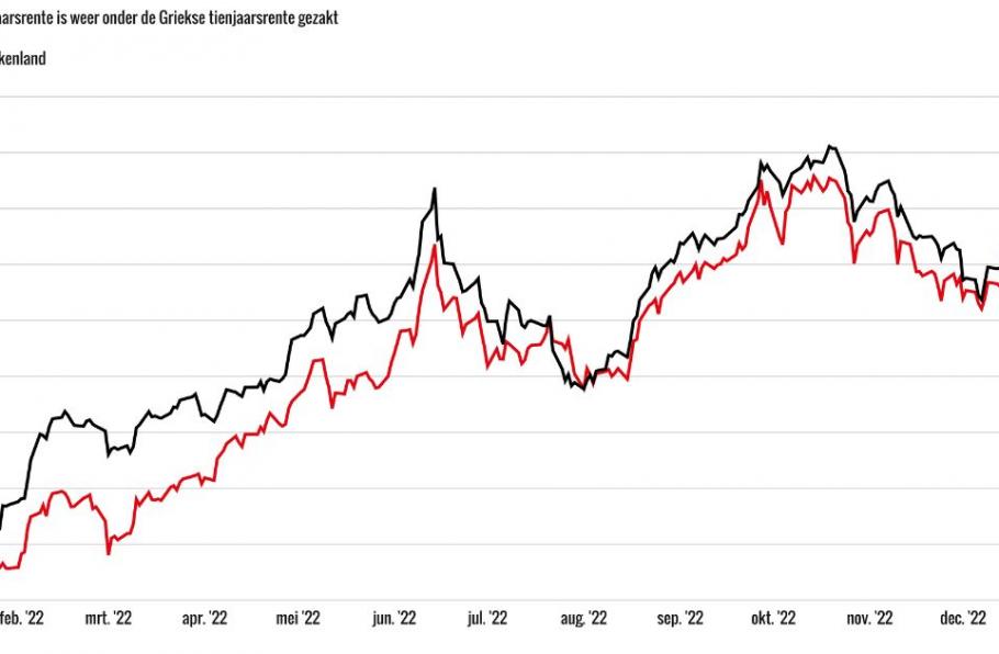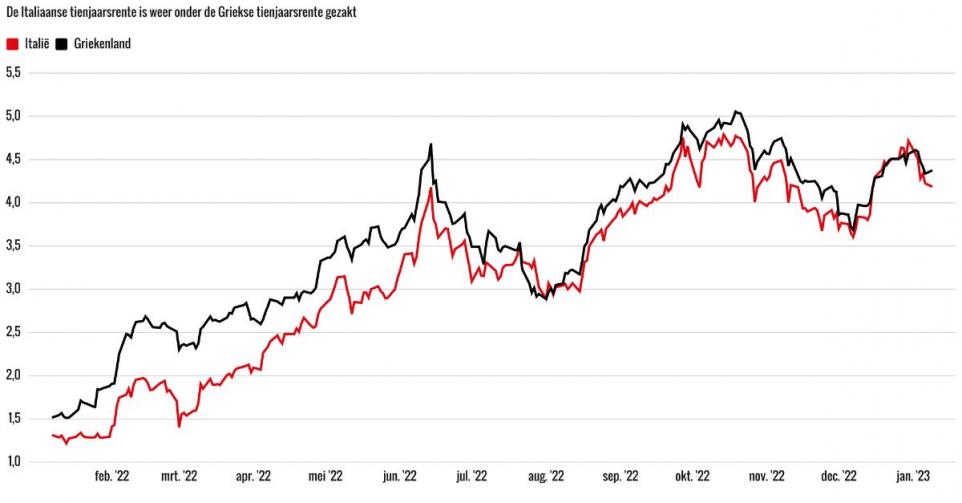 Door de scherpe daling is de Italiaanse tienjaarsrente weer onder de Griekse tienjaarsrente gezakt. Eind vorig jaar lag de lange rente in Italië nog bijna twintig basispunten boven de Griekse. Toch is Société Générale positiever over Griekse dan over Italiaanse staatsleningen. Volgens de bank stevent Griekenland in 2026 af op het hoogste begrotingsoverschot in de eurozone. Een jaar later kan de verhouding tussen staatsschuld en bbp op het niveau van Italië komen.