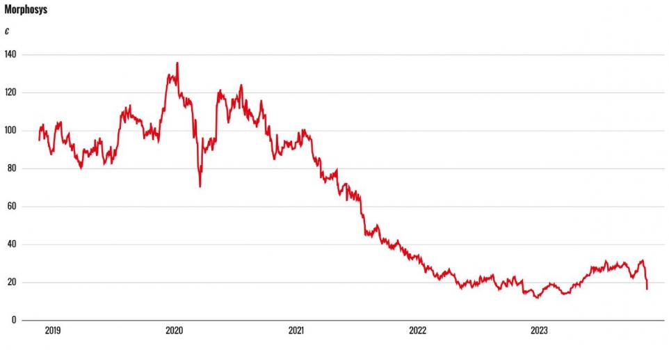 Sinds de intraday piek van €146,30 in januari 2020 is de koers van het Duitse biotechbedrijf Morphosys in vrijwel een rechte lijn gedaald.
