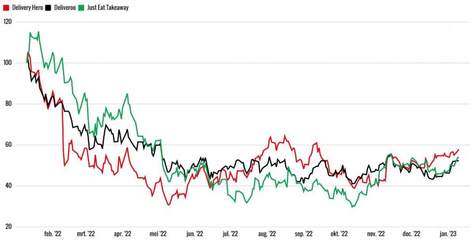 Ook in het nieuwe jaar behoort het aandeel Just Eat Takeaway met +15% in de eerste zes handelsdagen tot de grootste Amsterdamse stijgers. Zoals u in de grafiek kunt zien, bewoog de koers van Just Eat Takeaway de afgelopen twaalf maanden in grote lijnen mee met die van de twee belangrijkste sectorgenoten.