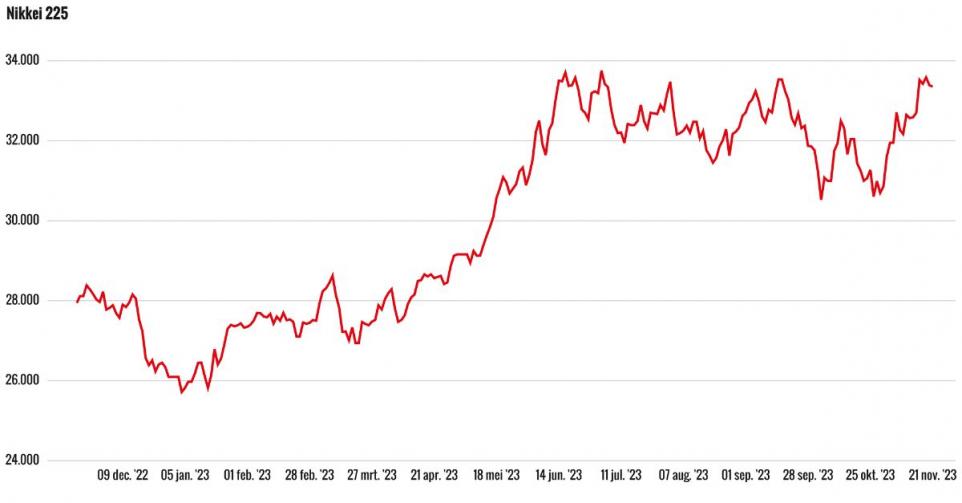 Dit jaar wint de Nikkei al 29,8%. Tegelijkertijd is de Japanse yen 13,1% verzwakt ten opzichte van de euro, mede door de lage rentes in Japan. In euro’s resteert er een koerswinst van 12,9%. Dat is nog steeds beter dan bijvoorbeeld de 8,4% van AEX. In beide gevallen ligt het totaalrendement iets hoger door dividenduitkeringen.
